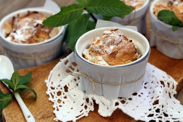 7. وزعي السوفليه في أطباق الفرن المجهزة وضعيها على صينية وأدخليها الفرن لمدة 15 دقيقة حتى تصبح ذهبية ويرتفع السوفليه.