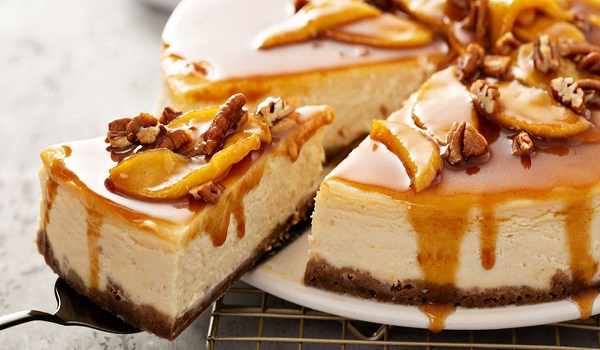 6. يُطلى سطح الـ”تشيزكيك” بطبقة الكراميل. ويُقدَّم الـ”كيك”، باردًا.