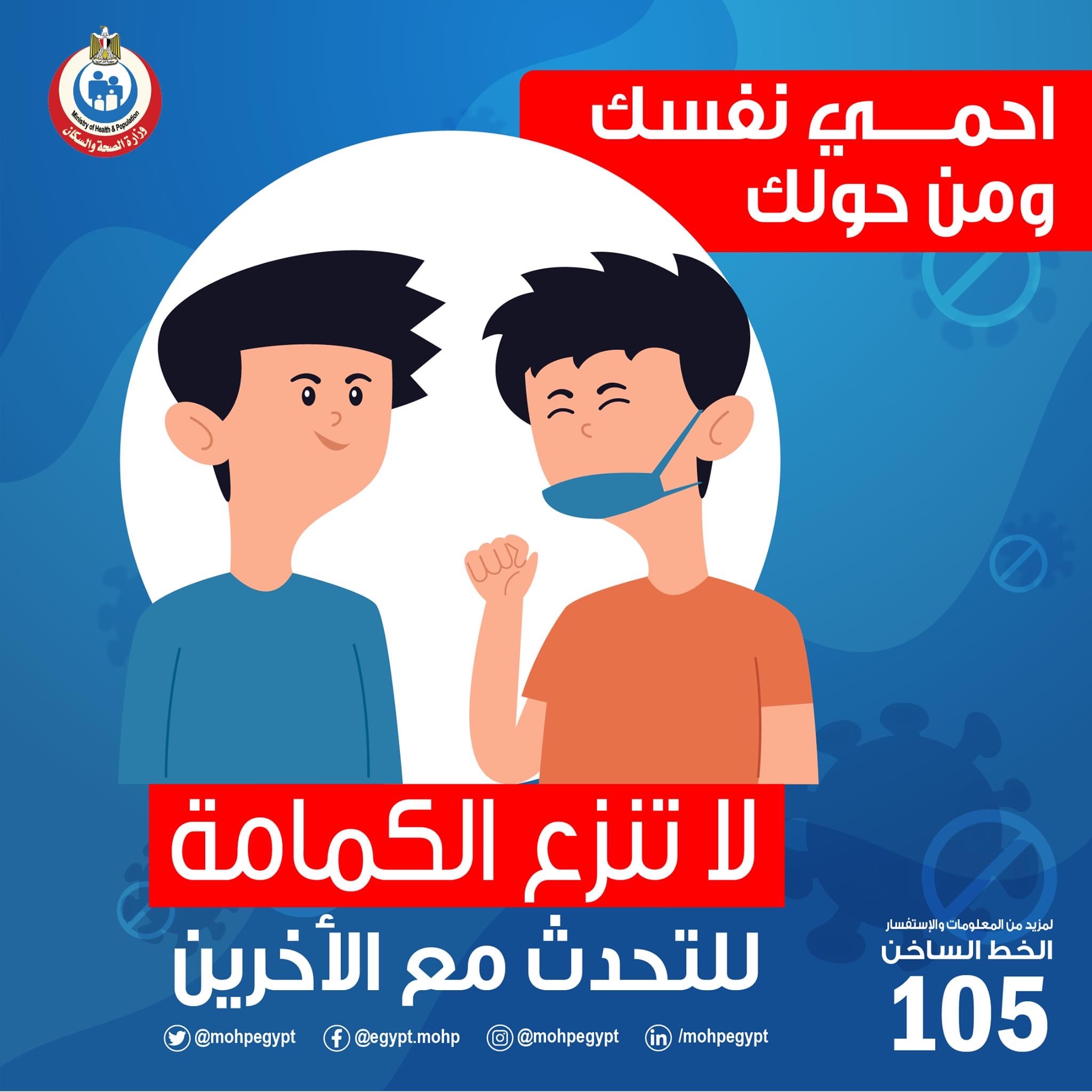 حذرت وزارة الصحة والسكان المواطنين من اللجوء إلي نزع الكمامة عند التحدث مع الآخرين، لمنع انتقال عدوى كوفيد 19 عن طريق الرذاذ أثناء الحديث، وحذرت الوزارة أيضا، في منشور اليوم […]